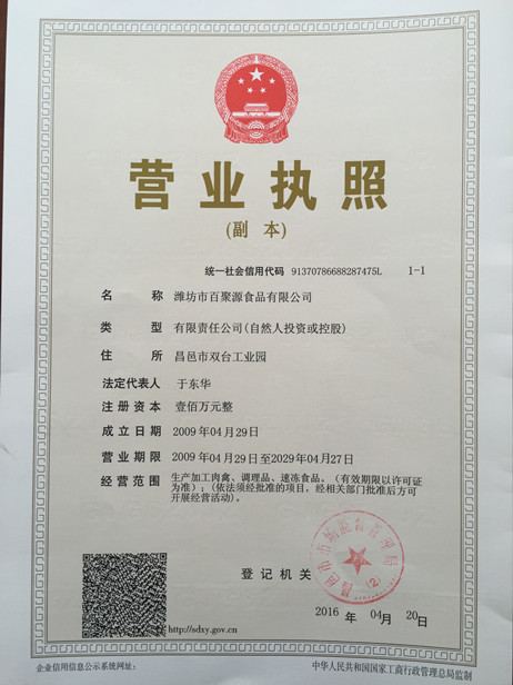 濰坊市百聚源食品有限公司成立于2009年7月份,現(xiàn)位于山東省昌邑市雙臺(tái)工業(yè)園。本公司是一家專(zhuān)業(yè)研究、開(kāi)發(fā)、生產(chǎn)及銷(xiāo)售調(diào)理食品的企業(yè),主要產(chǎn)品面向全國(guó)市場(chǎng),主要市場(chǎng)有北京、上海、福建、江蘇、廣東、湖北等大型城市的學(xué)校、中級(jí)西式餐廳、大中型商超及行政事業(yè)單位及企業(yè)的配餐供應(yīng)。公司引進(jìn)了國(guó)內(nèi)的生產(chǎn)技術(shù)和設(shè)備,年深化加工能力10000噸肉禽產(chǎn)品,將禽肉產(chǎn)品調(diào)理深化加工后,成為可以直接面對(duì)消費(fèi)者的高端產(chǎn)品。產(chǎn)品在國(guó)內(nèi)食品行業(yè)內(nèi)具有較高水平。公司于2009年取得全國(guó)工業(yè)產(chǎn)品生產(chǎn)許可證,于同年取得清真食品生產(chǎn)經(jīng)營(yíng)資格。于2011年五月份被昌邑市政府評(píng)為“2010年度食品安全生產(chǎn)先進(jìn)經(jīng)營(yíng)單位”。2018年被市政府評(píng)為“昌邑市標(biāo)桿企業(yè)”